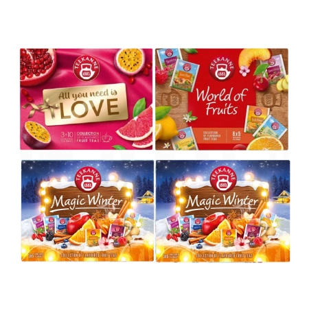 Teekanne Zestaw Herbat World of Fruits, Love Collection & 2x Magic Winter to idealna propozycja dla tych, którzy chcą odkrywać różnorodne smaki przez cały rok. Dzięki połączeniu letnich, egzotycznych oraz zimowych herbat, każda filiżanka przynosi nowe doznania smakowe. To także świetny sposób na wprowadzenie zdrowego i smacznego napoju do codziennej diety.