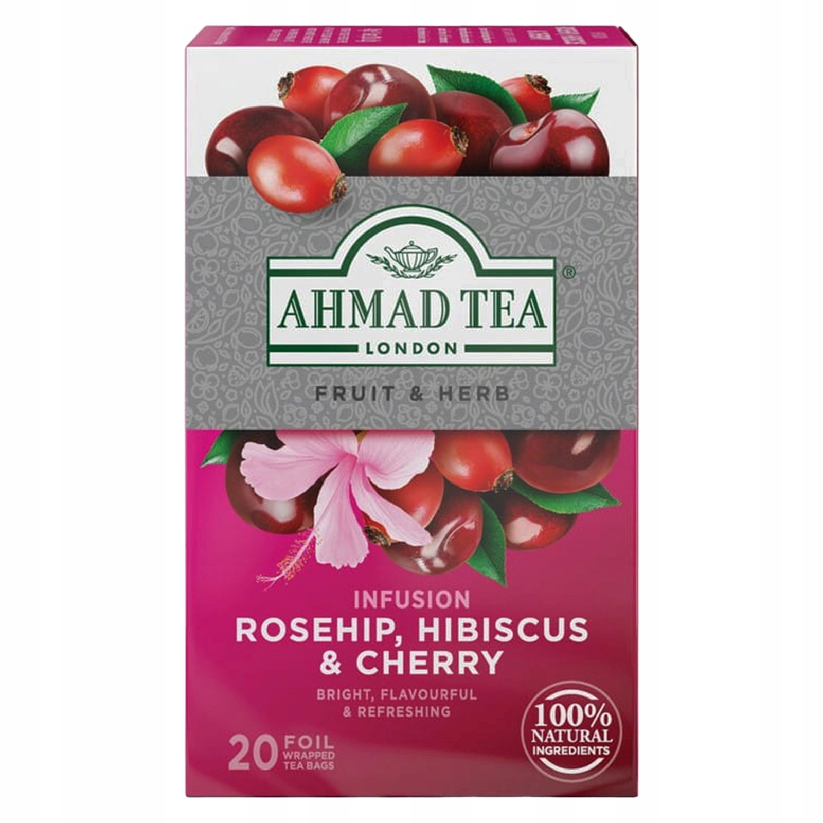 Dzika róża, wiśnia, hibiskus – Połączenie owoców dzikiej róży, wiśni i hibiskusa, które tworzy kwiatowy, owocowy napar, doskonały na relaks.