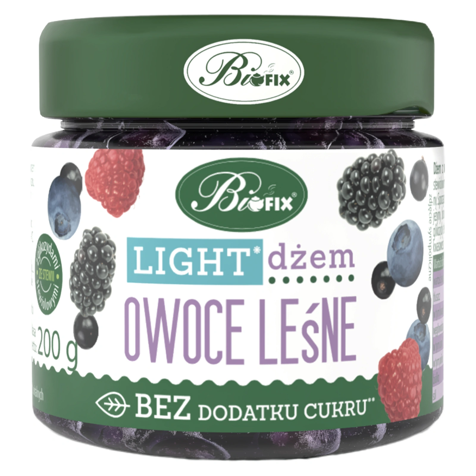 Składniki: owoce leśne 58% (maliny, jeżyny, borówki amerykańskie, czarne porzeczki), woda, substancje słodzące: maltitol i glikozydy stewiolowe 0,019%, truskawki 2%, substancje żelujące – pektyny, regulator kwasowości – kwas cytrynowy