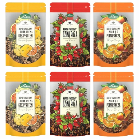 Zestaw oferuje trzy różne profile smakowe, które pozwalają sięgać po inny napar w zależności od nastroju. Każda kompozycja wyróżnia się wyraźnym aromatem i dobrze zbalansowanym smakiem owoców. Różnorodność sprawia, że codzienne picie naparów staje się przyjemnym rytuałem bez monotonii. To wygodny sposób na odkrywanie różnych owocowych akcentów w naturalnej formie.
