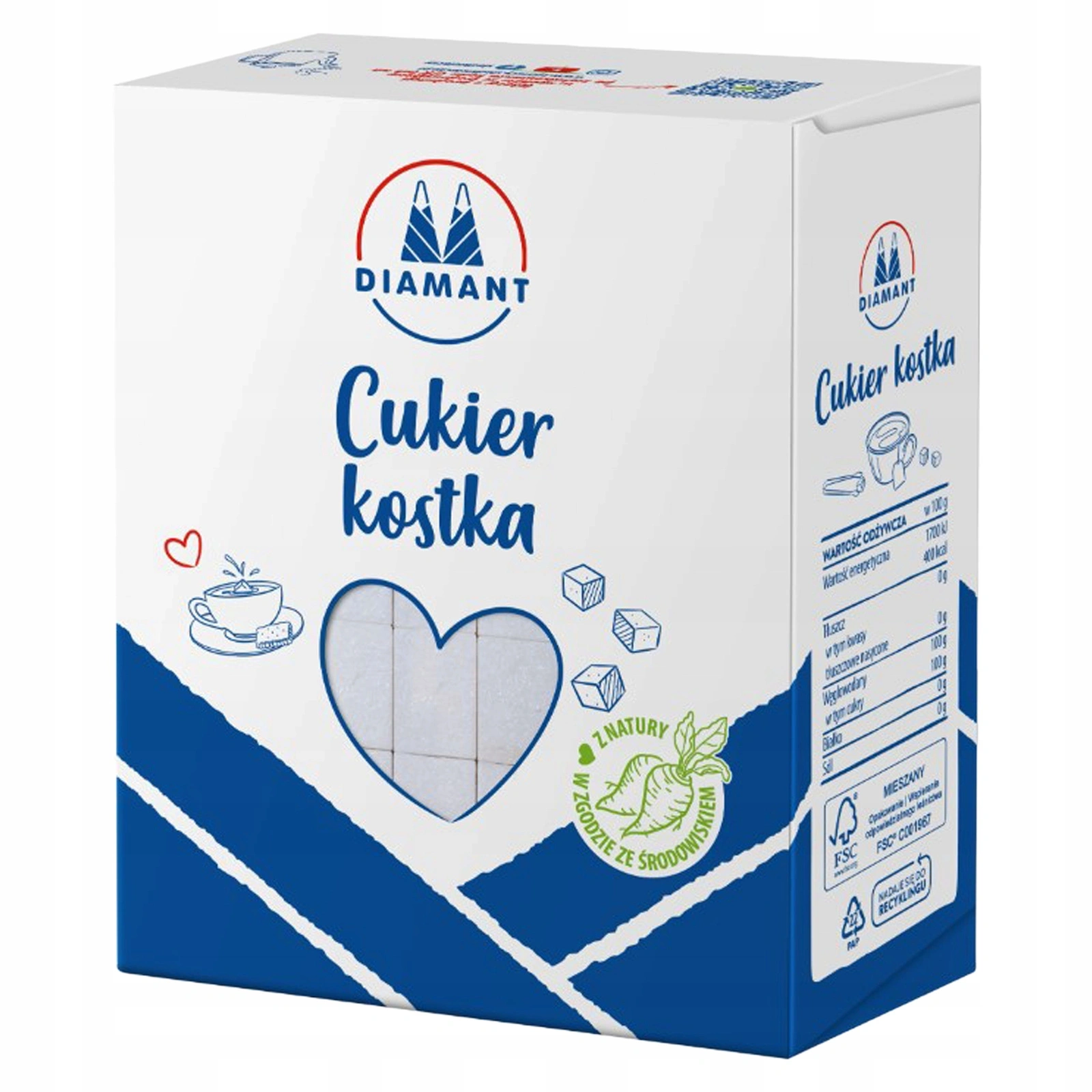 Cukier biały w kostkach – W 100 g: Wartość energetyczna 400 kcal, Tłuszcz 0 g, w tym kwasy tłuszczowe nasycone 0 g, Węglowodany 100 g, w tym cukry 100 g, Białko 0 g, Sól 0 g