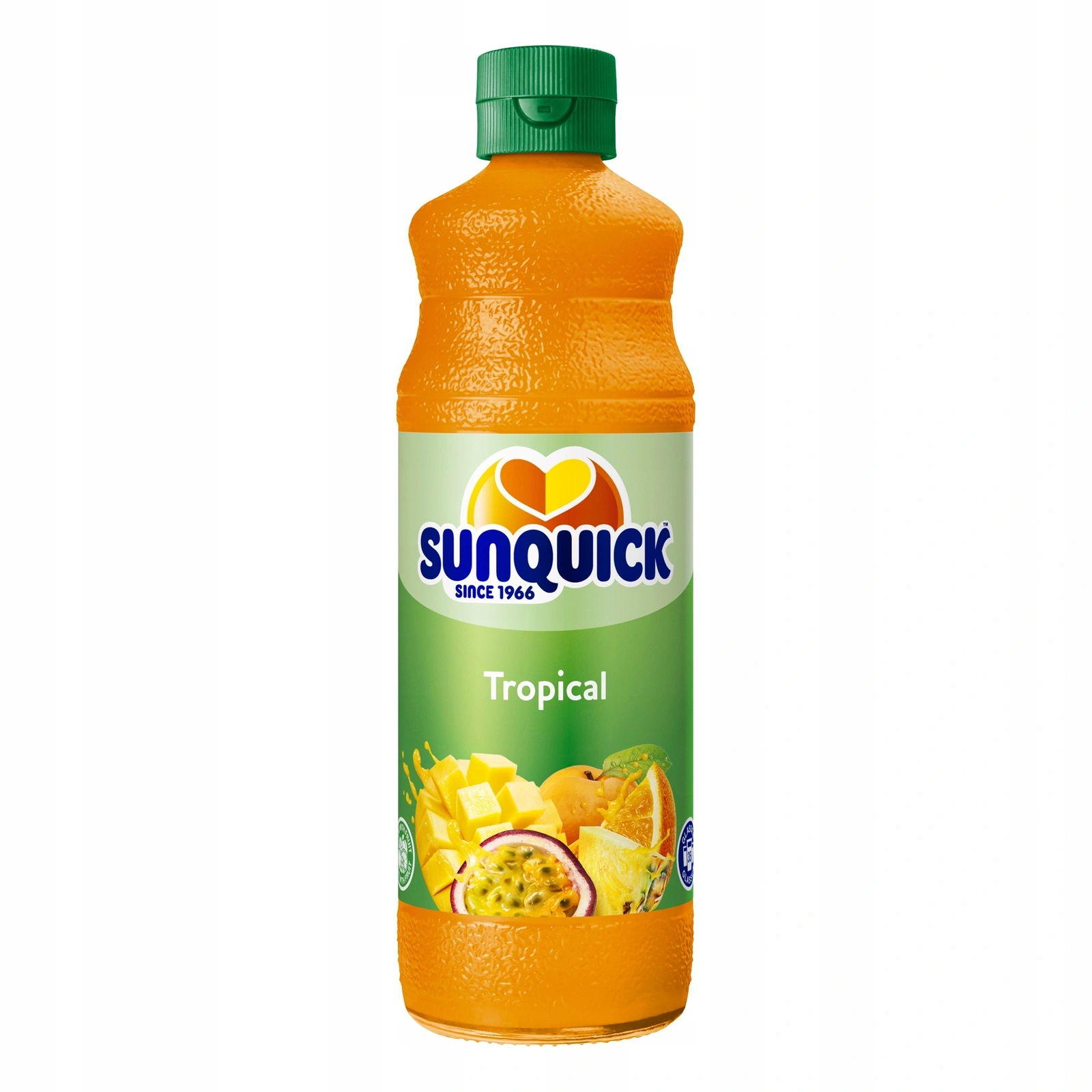 Sunquick Owoce tropikalne : cukier, woda, sok owocowy z zagęszczonego soku owocowego i przecier owocowy z zagęszczonego przecieru owocowego (25%) (sok ananasowy, sok pomarańczowy, sok z owoców marakuii, przecier z mango, przecier z bananów, przecier z moreli), regulator kwasowości (kwas cytrynowy, cytryniany potasu), środki aromatyzujące zawierające substancje z mleka, stabilizator (guma celulozowa, guma guar, pektyny), substancja konserwująca (pirosiarczyn sodu, sorbinian potasu), przeciwutleniacz (kwas askorbinowy), barwnik (beta-karoten, beta-apo-8'-karotenal)