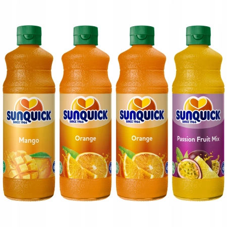 Sunquick Pomarańcza: cukier, woda, sok pomarańczowy z zagęszczonego soku owocowego (13%), sok cytrynowy z koncentratu (12%), regulator kwasowości (kwas cytrynowy, cytryniany potasu), środki aromatyzujące zawierające substancje z mleka, stabilizator (guma celulozowa, guma guar, pektyny), substancja konserwująca (wodorosiarczyn sodu, sorbinian potasu), przeciwutleniacz (kwas askorbinowy), barwnik (beta-karoten, beta-apo-8'-karotenal)