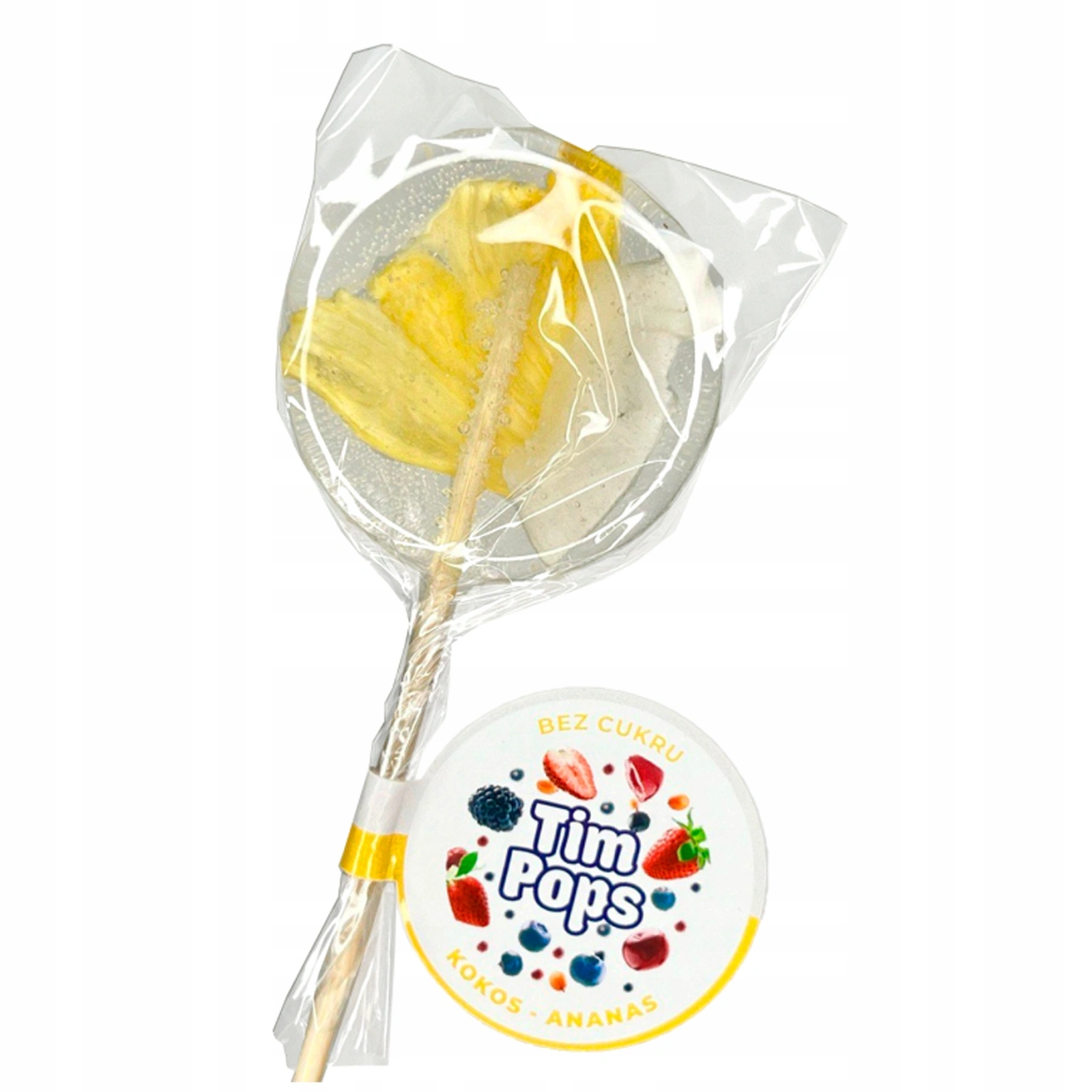 TimPops kokosowo-ananasowy to tropikalna słodycz bez dodatku cukru, która łączy smak egzotycznego kokosa z soczystym ananasem. To idealna przekąska dla każdego, kto ceni naturalny smak, wygodę oraz zdrowy styl życia. W środku lizaka znajduje się prawdziwy owoc, który nadaje mu świeżość i oryginalność