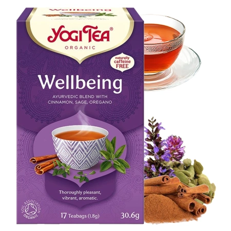 Yogi Tea Wellbeing to wyjątkowa ziołowa kompozycja inspirowana ajurwedyjską tradycją, stworzona z myślą o harmonii, spokoju i codziennym wsparciu dla organizmu. Korzenno-ziołowe nuty cynamonu, szałwii i kardamonu doskonale łączą się z cytrusową świeżością trawy cytrynowej i werbeny, tworząc napar, który koi zmysły i wspiera dobre samopoczucie.