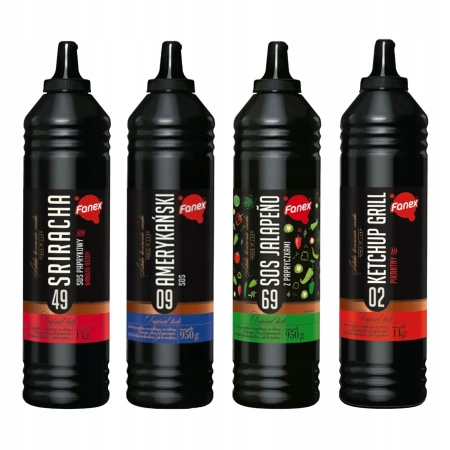 Zestaw 4 sosów pikantnych od Fanex to propozycja dla tych, którzy kochają wyraziste, ogniste smaki. W skład zestawu wchodzą kultowe, ostre i aromatyczne sosy: klasyczna Sriracha, kremowy sos amerykański, ketchup grill pikantny oraz intensywny sos z papryczkami Jalapeño. To zestaw, który wzbogaci każdy posiłek i zamieni zwykłe danie w wybuchową kulinarną ucztę.