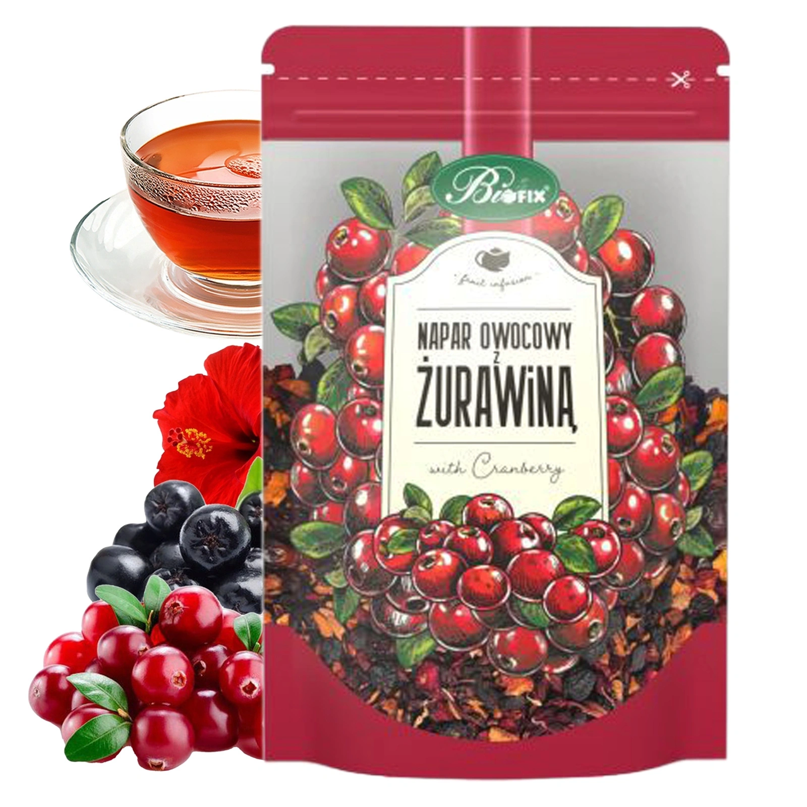 Żurawina: żurawina, hibiskus, aronia, jabłko, czarny bez, czarna porzeczka, dzika róża, koncentrat soku z aronii, aromat