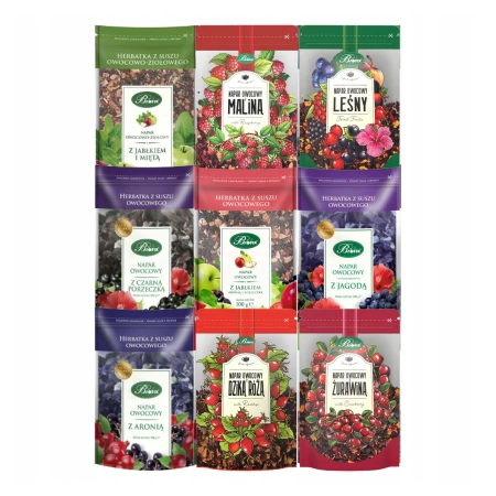 Leśny: czarny bez, jagoda, aronia, jabłko, głóg, hibiskus, dzika róża, jarzębina, aromat